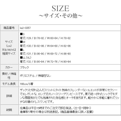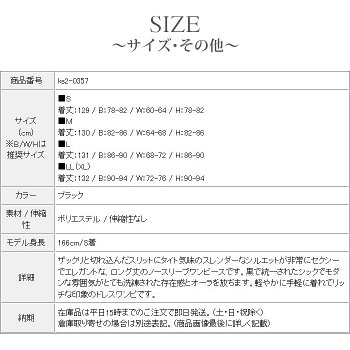 商品番号 ks2-0357 サイズ(cm)※B/W/Hは推奨サイズ ■S着丈:129 / B:78-82 / W:60-64 / H:78-82■M着丈:130 / B:82-86 / W:64-68 / H:82-86■L着丈:131 / B:86-90 / W:68-72 / H:86-90■LL(XL)着丈:132 / B:90-94 / W:72-76 / H:90-94 カラー ブラック 素材 / 伸縮性 ポリエステル / 伸縮性なし モデル身長 166cm/S着 詳細 ザックリと切れ込んだスリットにタイト気味のスレンダーなシルエットが非常にセクシーでエレガントな、ロング丈のノースリーブワンピースです。